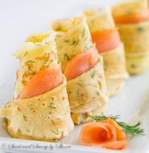 Bánh crepe có thể được cuốn với nhân phomai, nhân nấm, thịt băm, cá hồi, cá muối hoặc sang trọng hơn nữa là dùng với trứng cá hồi.